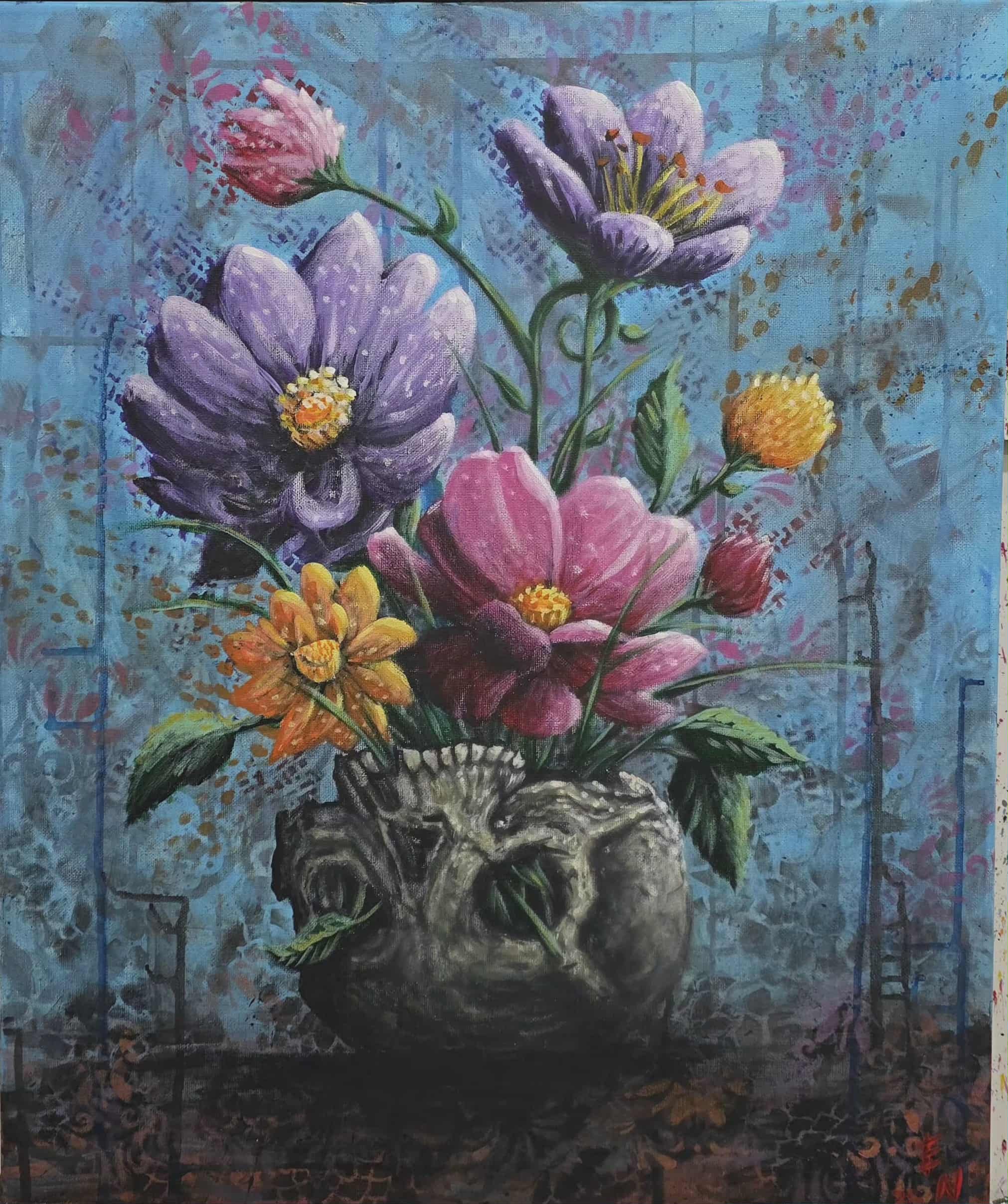 This painting is a visual expression of the Christian belief that God specializes in transformation—turning what is dead, broken, or forgotten into something vibrant and alive. The flowers bursting forth from a vessel shaped like a weathered, hollow “grave” symbolize the miracle of divine renewal: beauty growing from places that once held only loss.