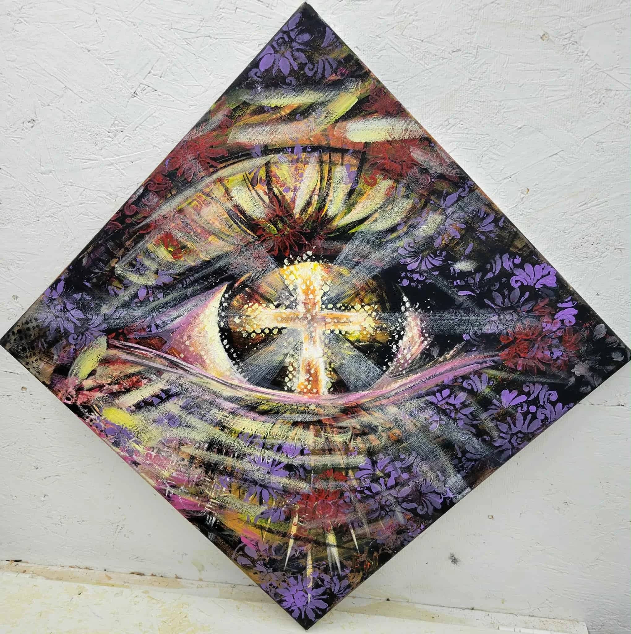 This piece serves as a visual meditation on the phrase “Keep your eye on the cross.” The eye represents focus, faith, and vision — the act of centering one’s gaze on Jesus and His sacrifice. Within the pupil, the cross radiates light, symbolizing both suffering and redemption, the pain of humanity and the hope of salvation.