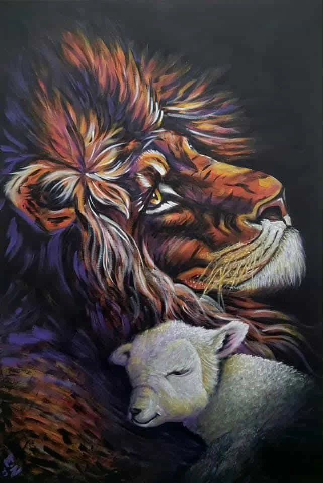 This painting reflects one of Scripture’s most powerful and paradoxical truths: Jesus Christ is both the mighty Lion of Judah and the gentle Lamb of God. These two images—seemingly opposite—come together to form a complete and unified portrait of His nature.